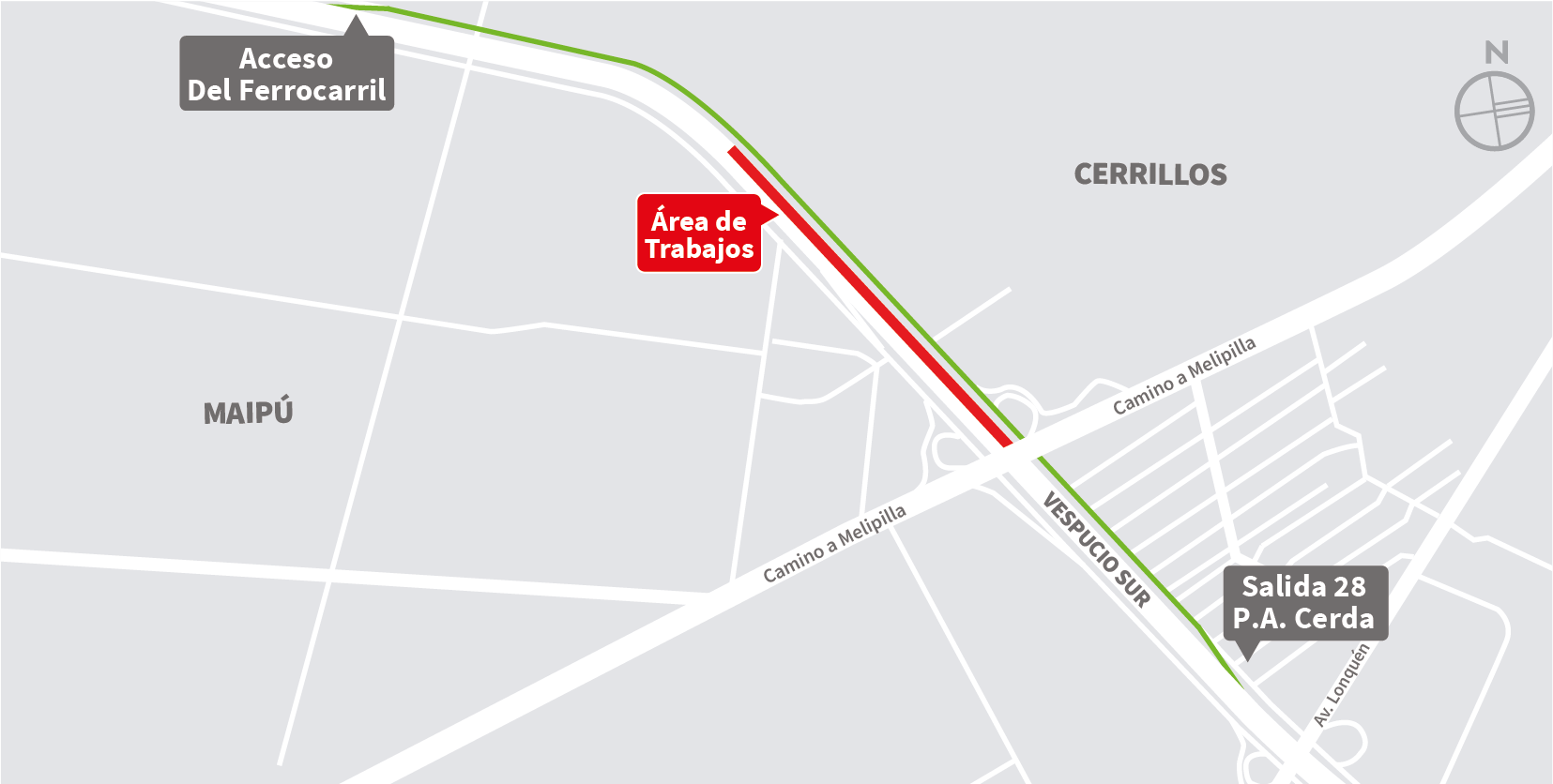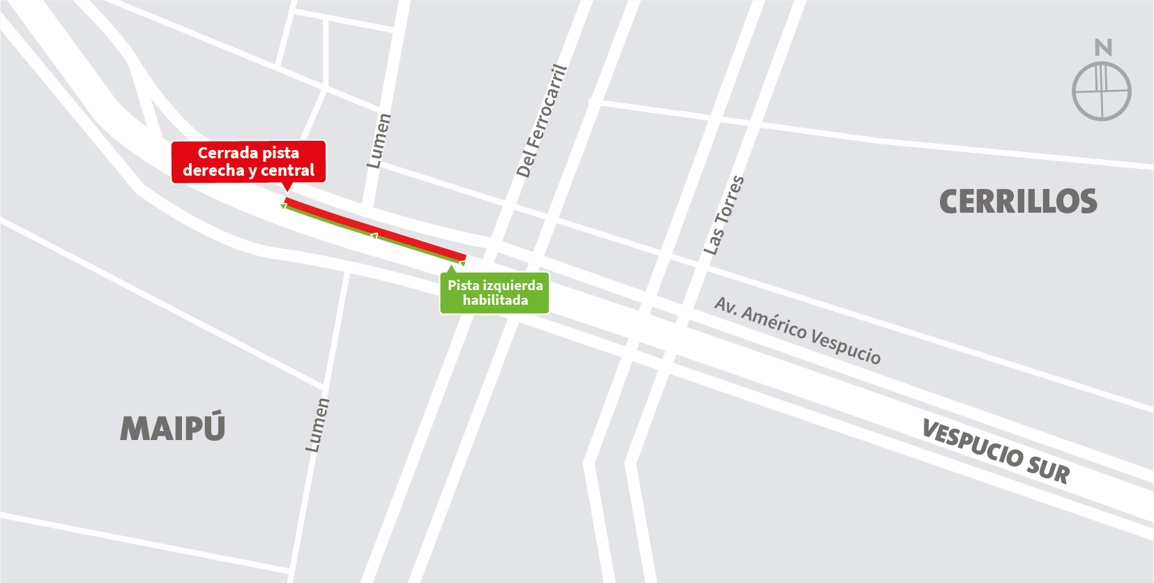 | Miércoles 07-01-2026 | 22:00 a 06:00 horas | 1 | Paso sobre nivel Del Ferrocarril | Oriente | Maipu – Cerrillos | Segregación de vía local. / Desvío: Del Ferrocarril al sur, Volcán Tacora, Lumen, Av. Américo Vespucio al poniente, Retorno Rafael Riesco, Del Ferrocarril. Del Ferrocarril al norte, Caletera Vespucio, Los Tilos, Primavera, Salvador Allende. Mapa de trabajo → |