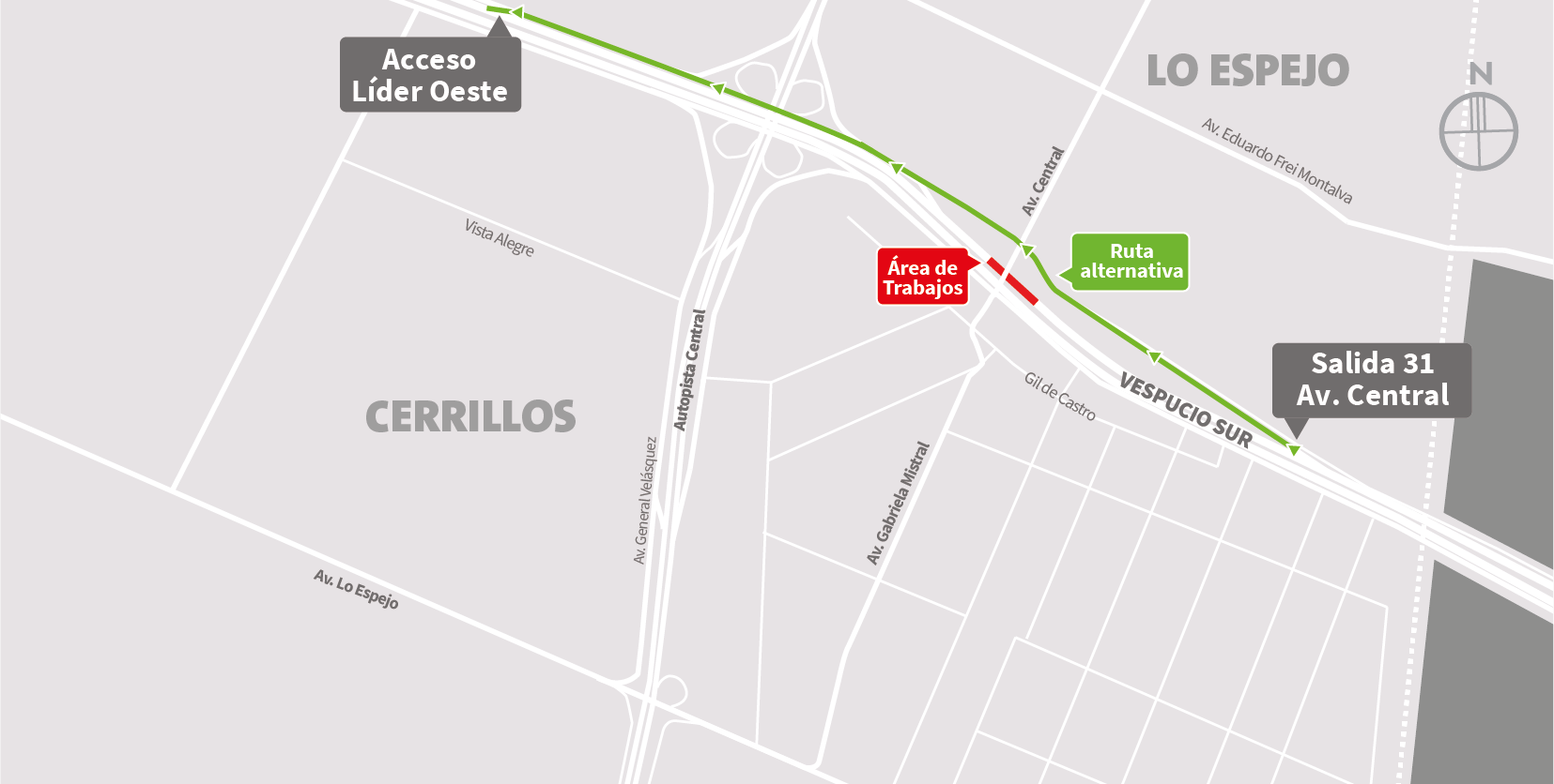 | 22:00 a 06:00 horas | 1 | Paso sobre nivel Av. Central | Oriente | Cerrillos – Lo Espejo | Segregación vía local. / Desvío: Av. Central al sur, Av. Américo Vespucio al poniente, Retorno Gral. Velásquez. Av. Central al norte, Av. Américo Vespucio al oriente, Retorno Ruta 5. Mapa de trabajo → |