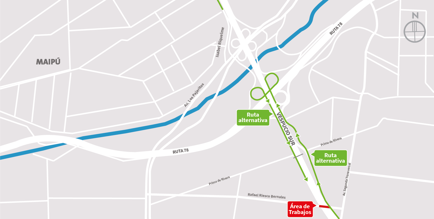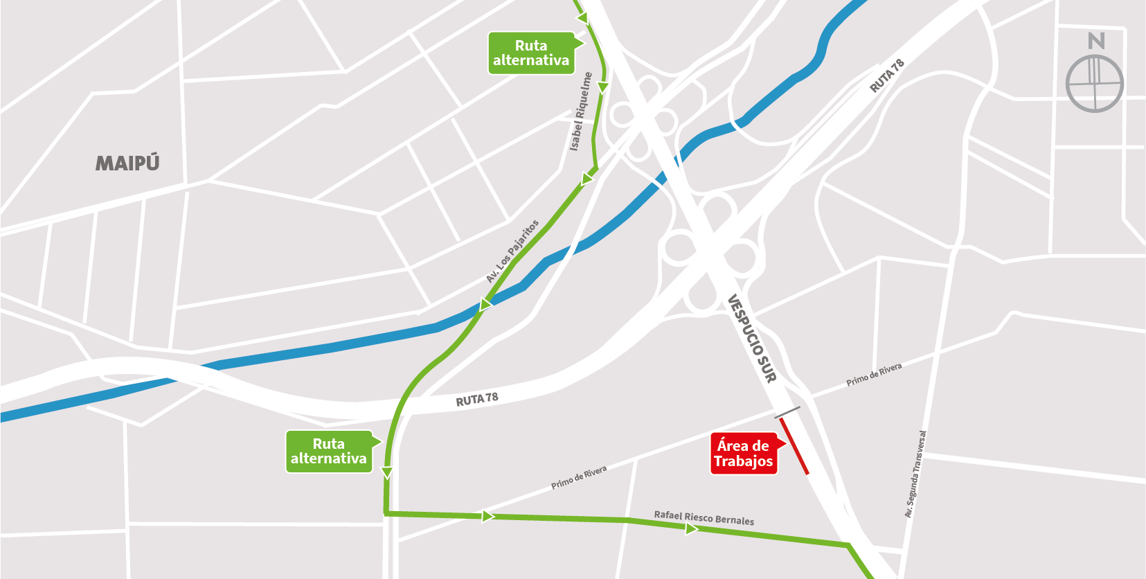 | Martes 06-01-2026 | 22:00 a 06:00 horas | 1 | Paso sobre nivel Rafael Riesco | Oriente | Maipú | Segregación de 3 pistas – Segregación vía local. / Desvío: Av. Américo Vespucio al poniente, Retorno Pajaritos, Av. Américo Vespucio al oriente. Mapa de trabajo → |