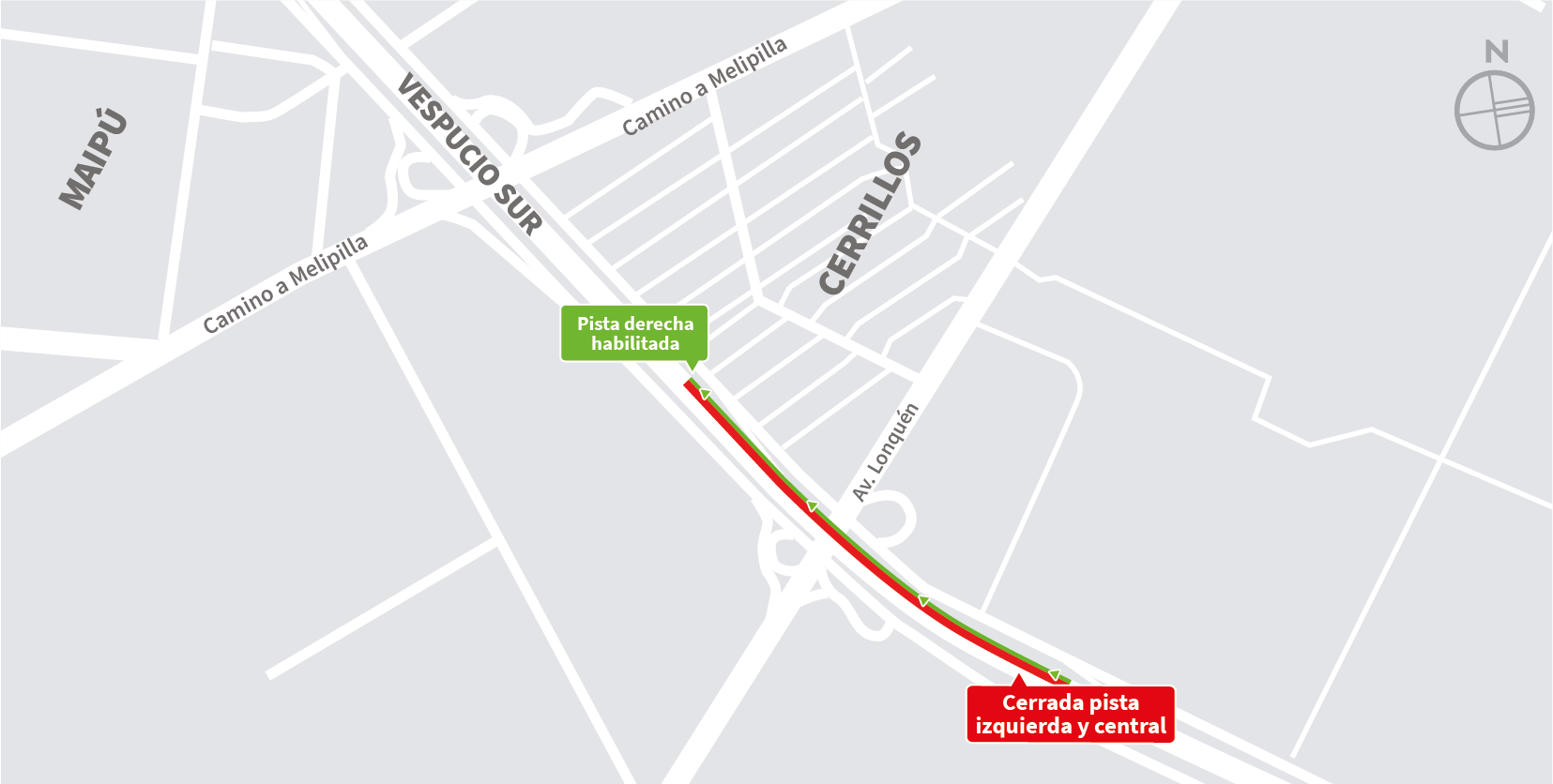 | 22:00 a 06:00 horas | 4 | Camino Melipilla | Oriente | Cerrillos | Segregación vía expresa. / Desvío: Av. Américo Vespucio al oriente, Salida 28, Reingreso en Acceso General Velásquez. Mapa de trabajo → |